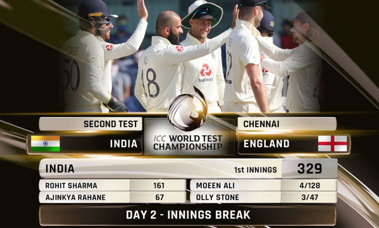 काठमाडौं : इंग्ल्यान्डविरुद्धको दोस्रो टेस्टको पहिलो इनिङ्समा घरेलु टिम भारत ३ सय २९ रन जोडेर अलआउट भएको छ। पहिलो इनिङ्समा भारतका लागि रोहित शर्माले १ सय ६१ रनको शतकीय इनिङ्स खेले। चेन्नईमा उनको यो पहिलो शतक हो। यस्तै अन्जिका रहानेले ६७ रन जोड्दा चेतेश्वर पुजारा २१ रन बनाए।
