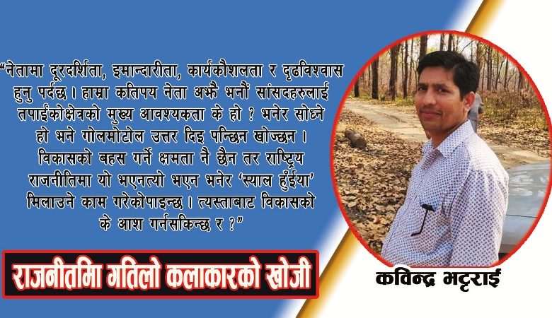 नेतामा दूरदर्शिता, ईमान्दारिता, कार्यकौशलता र दृढविश्वास हुनु पर्दछ । हाम्रा कतिपय नेता अझ भनौँ सांसदहरूलाई ‘ तपाईँको क्षेत्रको मूख्य आवश्यकता के हो ?’ भनेर सोध्ने हो भने गोलमटोल उत्तर दिइ पन्छिन खोज्छन । विकाशको वहस गर्ने क्षमता नै छैन् तर राष्ट्रिय राजनीतिमा यो भएन त्यो भएन भनेर “स्याल हुइँया” मिलाउने मात्र काम रहेको पाइन्छ । त्यसताबाट विकाशको के आश गर्न सकिन्छ र ?