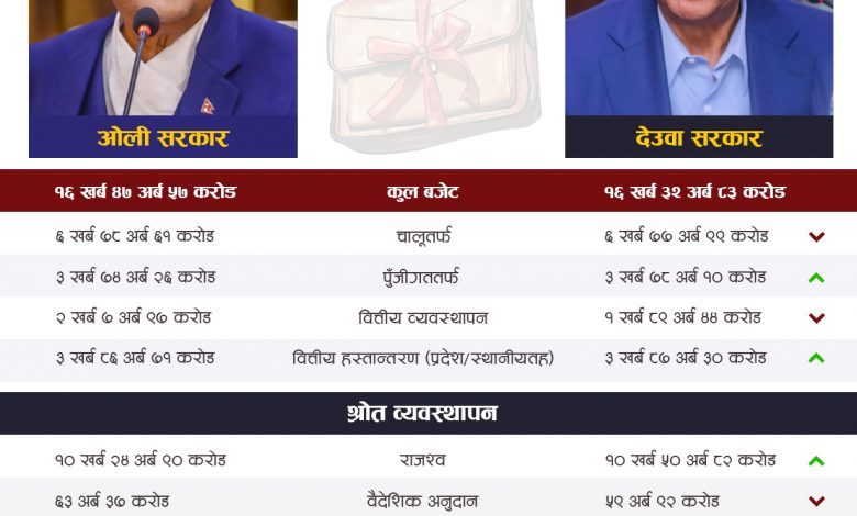 जबकि अघिल्लो सरकारले वैदेशिक ऋणबाट ३ खर्ब ९ अर्ब २९ करोड रुपैयाँ र आन्तरिक ऋणबाट २ खर्ब ५० अर्ब रुपैया जोहो गर्ने लक्ष्य लिएको थियो ।