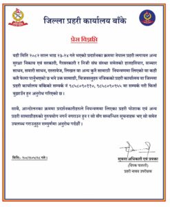 प्रहरीले भदौ २३ र २४ गतेको प्रदर्शनका क्रममा नेपाल प्रहरीलगायत अन्य सुरक्षा निकायको हातहतियार, सज्जा साधन एवं सरकारी, गैरसरकारी तथा निजी संघ–संस्थाका सवारी साधन, दस्तावेज, लिखत वा अन्य सामानहरु प्रदर्शनकारीले नियन्त्रणमा लिएको वा कहीं फेला परेको अवस्थामा नजिकैको प्रहरी कार्यालय वा जिल्ला प्रहरी कार्यालय बाँकेमा बुझाउन अनुरोध गरेको हो।