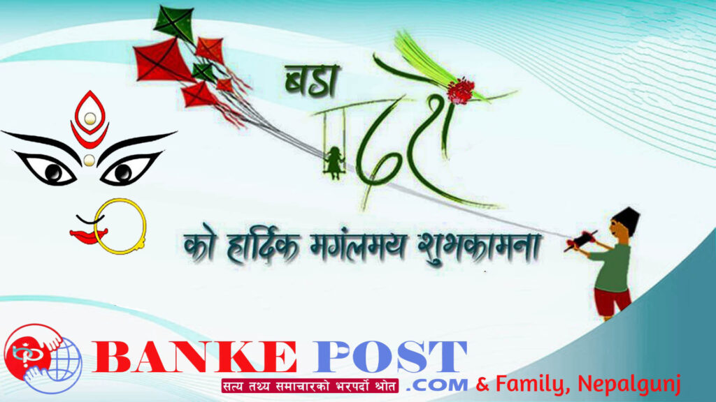 नेपालगन्ज । नेपालीहरूको महान चाड विजया दशमी अर्थात् दुर्गापक्षको मुख्य दिन, नवदुर्गाको प्रसादका रूपमा आज मान्यजनको हातबाट शुभ साइतको प्रतीक रातो टीका एवं समृद्धिको प्रतीक जमरा लगाइँदै छ । आश्विन शुक्ल दशमीका दिनमा मनाइने विजया दशमी पर्व बिहिवार हर्षोल्लासका साथ मान्यजनबाट दुर्गा भवानीको प्रसाद स्वरूप टीका, जमरा थापेर मनाइन्छ । दसैं घर वा पूजा कोठामा नौ दिनसम्म पूजा आराधना गरिएको प्रसाद आज मान्यजनबाट लगाइन्छ ।
