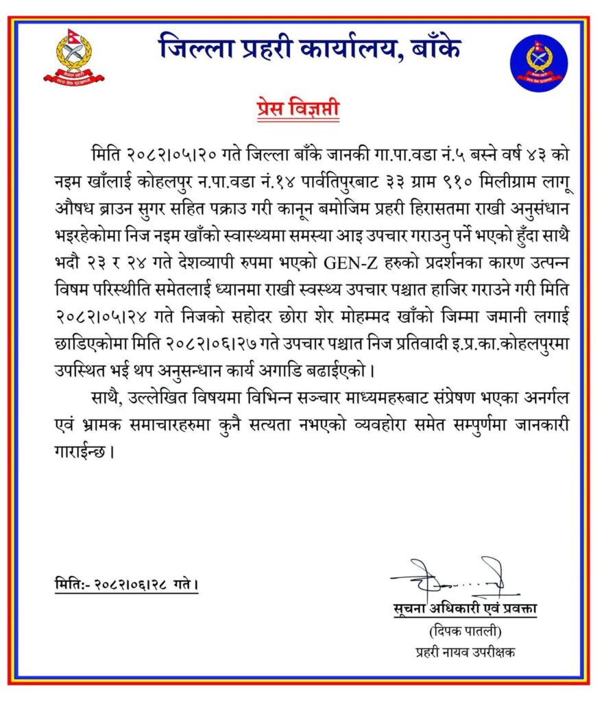 जिल्ला प्रहरी कार्यालय, बाँकेले जारी गरेको प्रेस विज्ञप्तिमा विभिन्न सञ्चार माध्यममा प्रसारित समाचारहरूमा सत्यता नरहेको जनाउँदै अनधिकृत वा अपुष्ट समाचार नफैलाउन सबैमा आग्रह गरिएको छ।