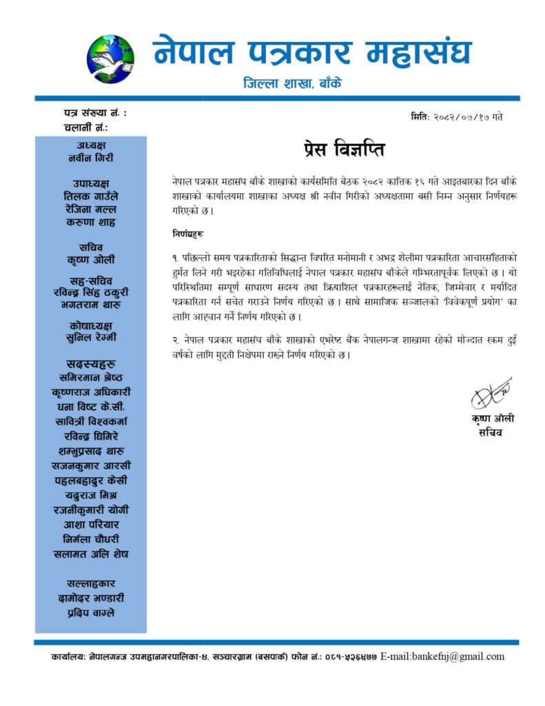 शाखाको कार्यसमिति बैठक कात्तिक १६ गते आइतबार अध्यक्ष नवीन गिरीको अध्यक्षतामा बसेर पछिल्लो समय पत्रकारिताको सिद्धान्त विपरीत भइरहेका मनोमानी र अभद्र गतिविधिहरूप्रति गम्भीर चिन्ता व्यक्त गर्दै यस्तो निर्णय गरेको हो।