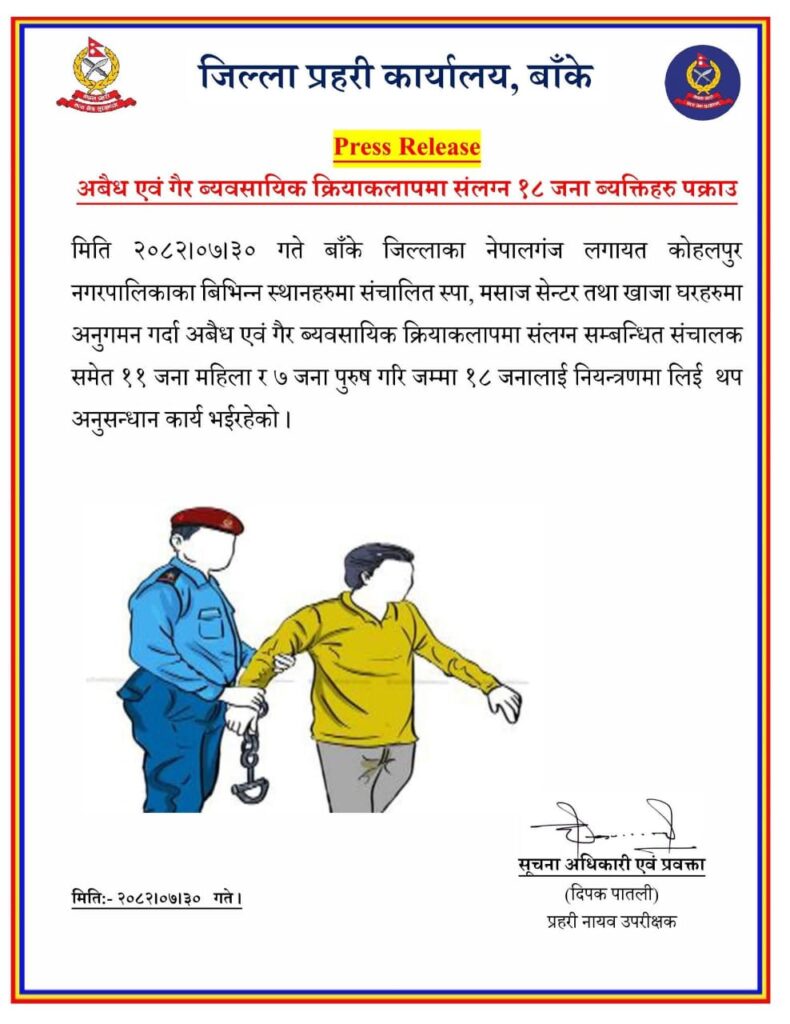 प्रहरीका अनुसार नेपालगञ्ज सहित कोहलपुर नगरपालिकाको विभिन्न स्थानमा सञ्चालन रहेका स्पा, मसाज सेन्टर तथा खाजा घरहरूको अनुगमनका क्रममा उनीहरू पक्राउ परेको हो ।