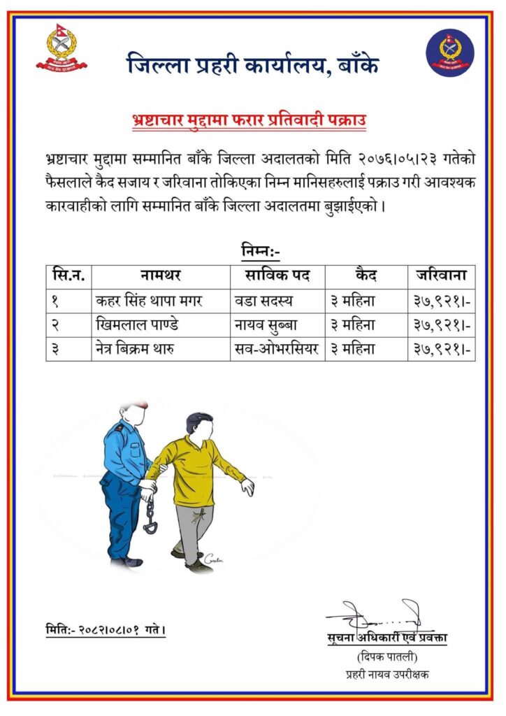 पक्राउ पर्ने फरार प्रतिवादीहरू कहर सिंह थापा मगर ३ महिना कैद र रु.३७,२९१/-जरिबाना खिमलाल पाण्डे नायव सुब्बा ३ महिना कैद र रु ३७,२९१/-जरिबाना नेत्र बिक्रम थारु सब–ओभरसियर ३ महिना कैद र रु.३७,२९१/-माथी कैद र जरिवाना दुबै रहेको प्रहरीले जनाएको छ ।