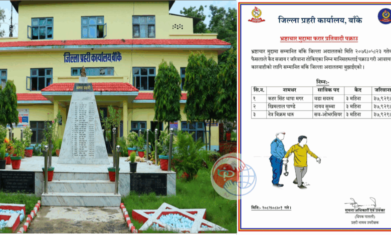 बाँके । जिल्ला प्रहरी कार्यालय बाँकेले जिल्ला अदालतबाट सजाय तोकिएका तीन जना भ्रष्टाचार मुद्दाका फरार प्रतिवादी हरु लाई पक्राउ गरेको छ। २०७६/०५/२३ गतेको अदालतको फैसलाले कैद तथा जरिवाना दुबै तोकिएका उनीहरू हाल समेत फरार रहेको प्रहरीले जनाएको छ ।