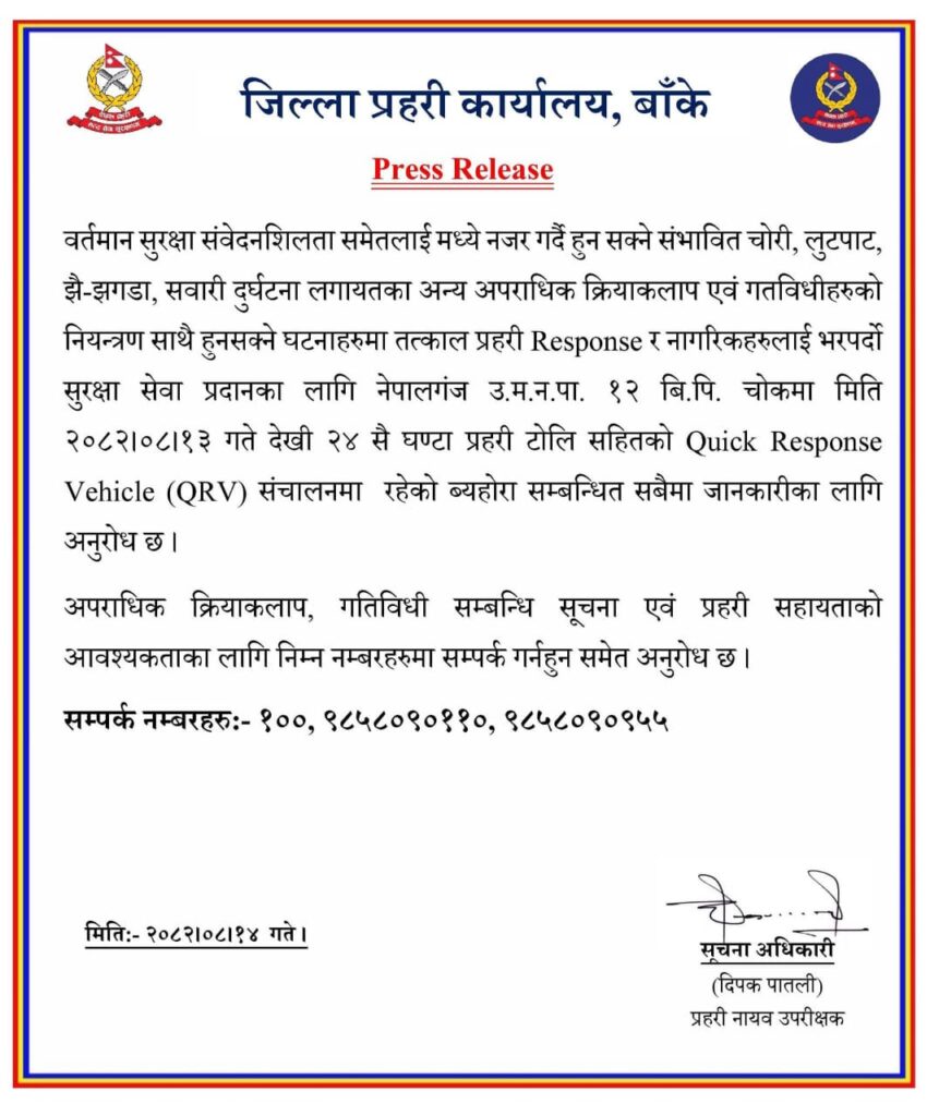 प्रहरीको भनाइअनुसार चोरी, लुटपाट, झैँ–झगडा, सवारी दुर्घटना तथा विभिन्न आपराधिक गतिविधि रोकथाम र घटनामा तुरुन्तै रेस्पोन्स र नागरिक लाई भरपर्दो सुरक्षा सेवा प्रदान गर्नका लागी नेपालगञ्ज उपमहानगरपालिका–१२ स्थित बिपी चौकमा QRV टोली निरन्तर संचालन मा राखिएको छ।