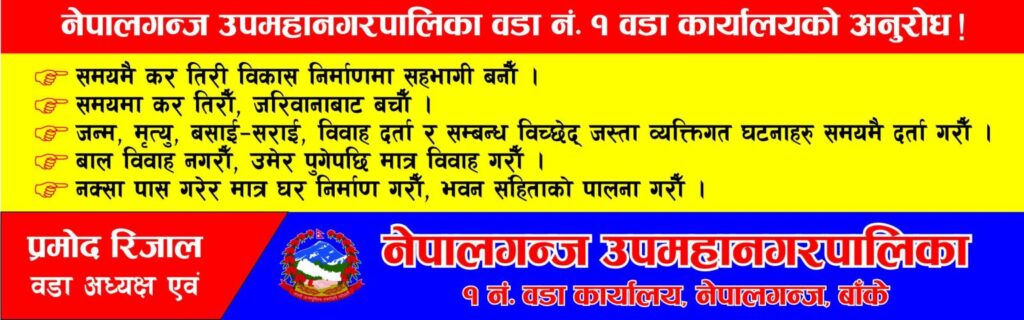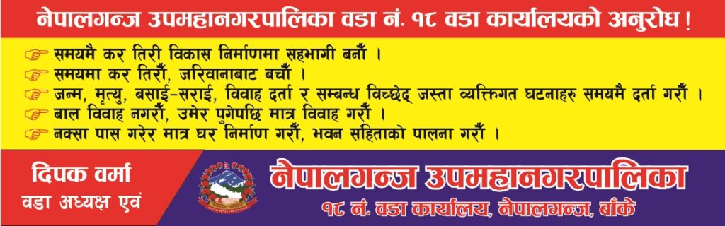 नेपालगञ्ज उपमहानगरपालिकाले आठौं विद्यालय स्तरीय मेयर कप तथा राष्ट्रपति रनिङ्गशिल्ड खेलाडी छनौट खेलकुद प्रतियोगिता सञ्चालन हुने र अत्यधिक चिसो मौसमका कारण बालबालिकाको स्वास्थ्यमा प्रतिकूल असर पर्ने समेत देखिएकाले पौष ११ देखि १४ गतेसम्म सार्वजनिक बिदा दिइएको शिक्षा, युवा तथा खेलकुद महाशाखाका उपसचिव गार्खबहादुर थापाले जानकारी दिए ।