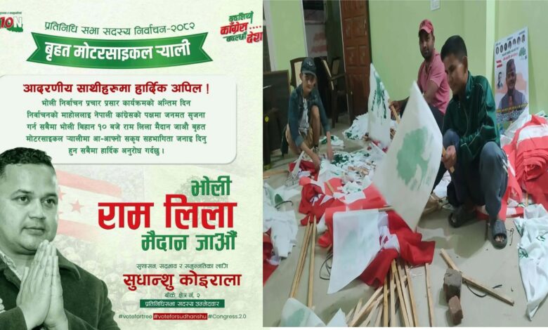 नेपाली कांग्रेस प्रतिनिधि सभा क्षेत्र नम्बर २ निर्वाचन प्रचार–प्रसार समितिका संयोजक उमा थापामगरका अनुसार सोमबार बिहान १० बजे स्थानीय रामलिला मैदानबाट र्याली सुरु हुनेछ ।