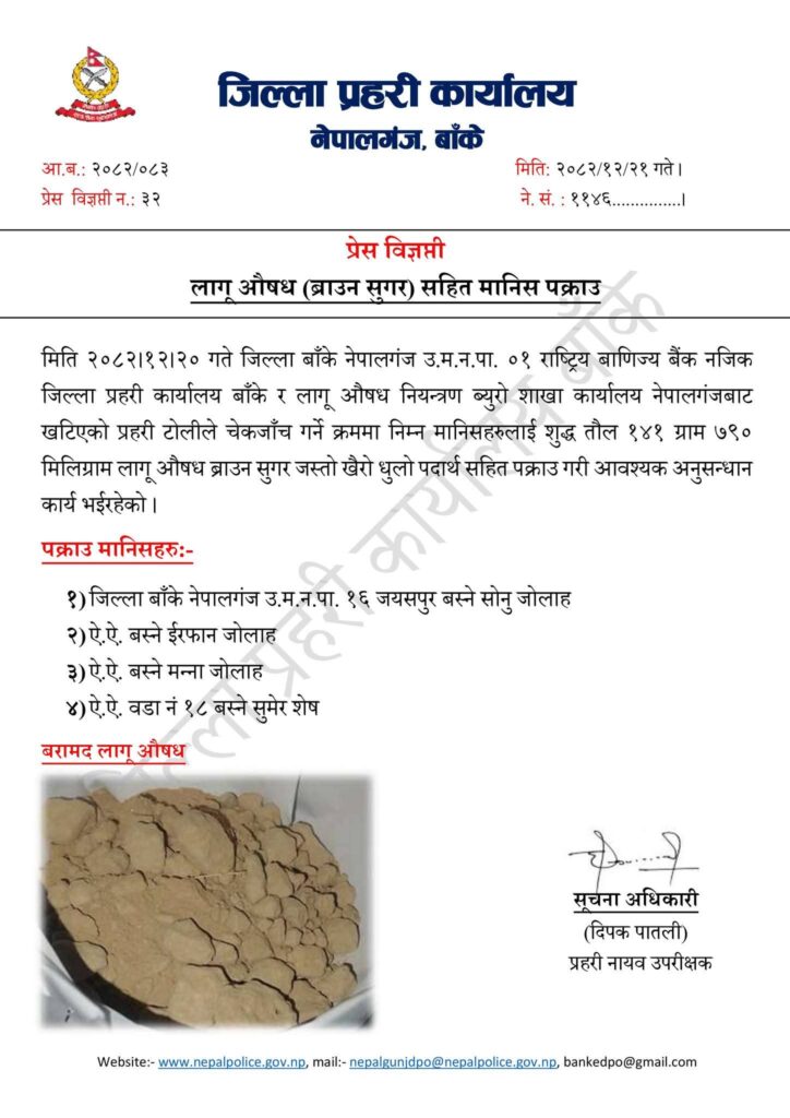 नेपालगञ्ज । हाल नेपालगन्ज क्षेत्र लागु औषध सेवन र बिक्री बितरण को आखाडा बन्दै गएको छ।जिल्ला प्रहरी कार्यालय बाँके ले लागूऔषध (ब्राउन सुगर) सहित ४ जनालाई पक्राउ गरेको छ।