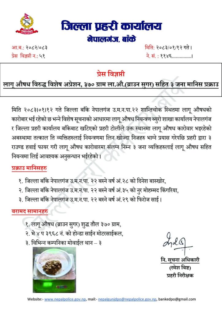 नेपालगञ्जमा ३७० ग्राम ब्राउन सुगरसहित ३ जना पक्राउ